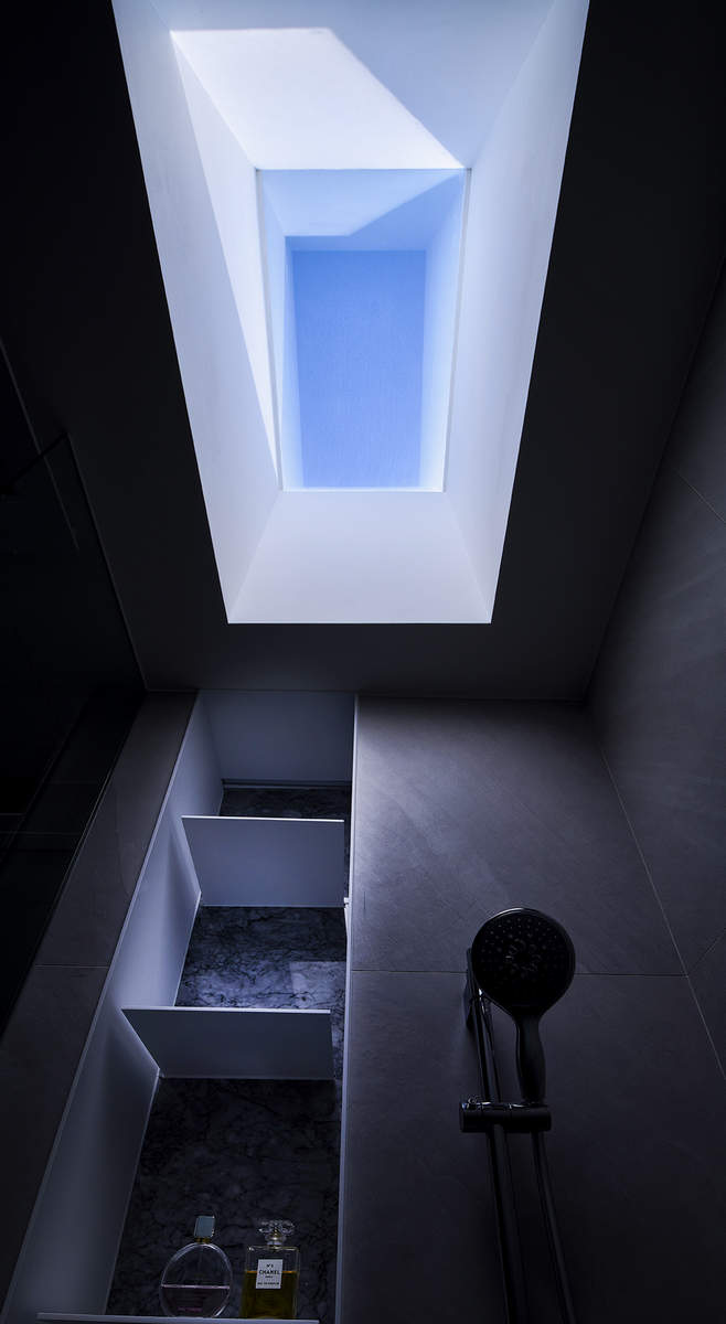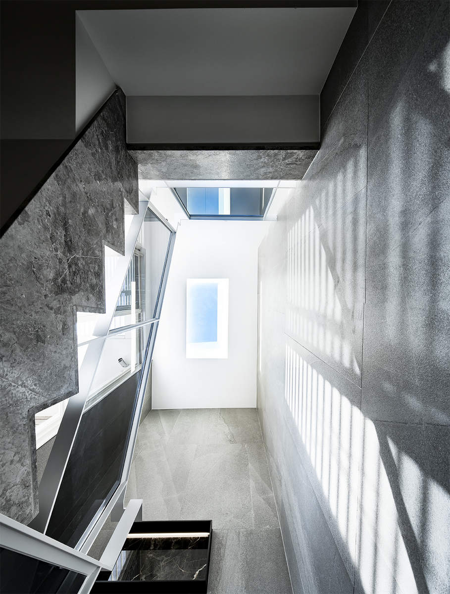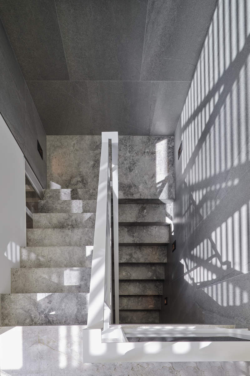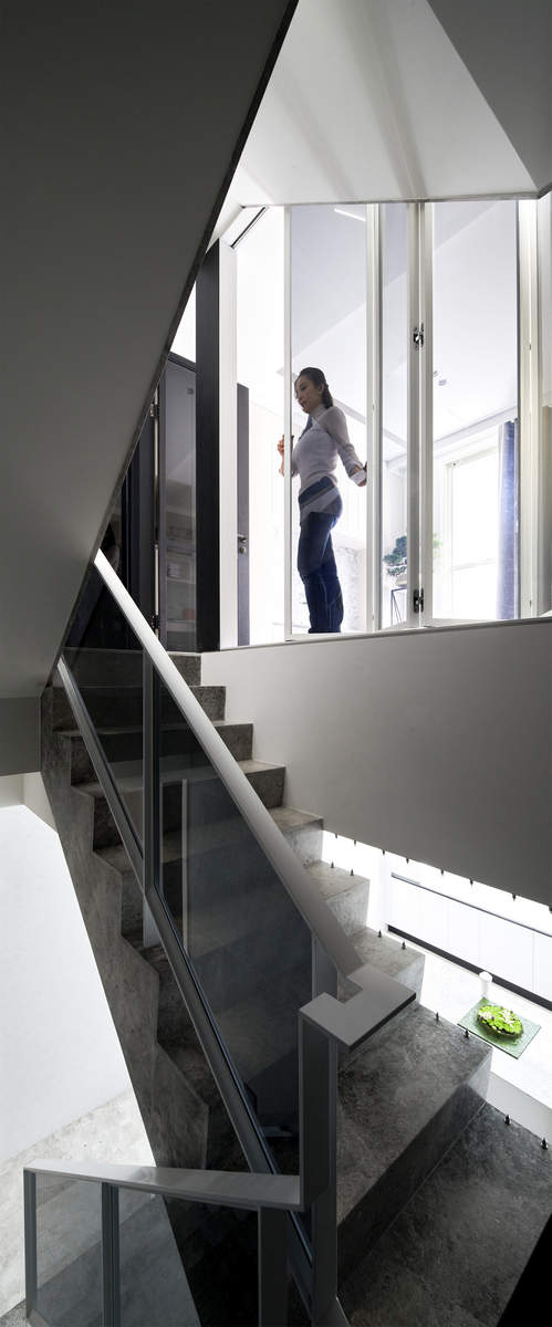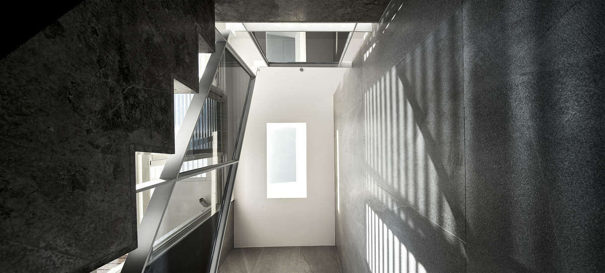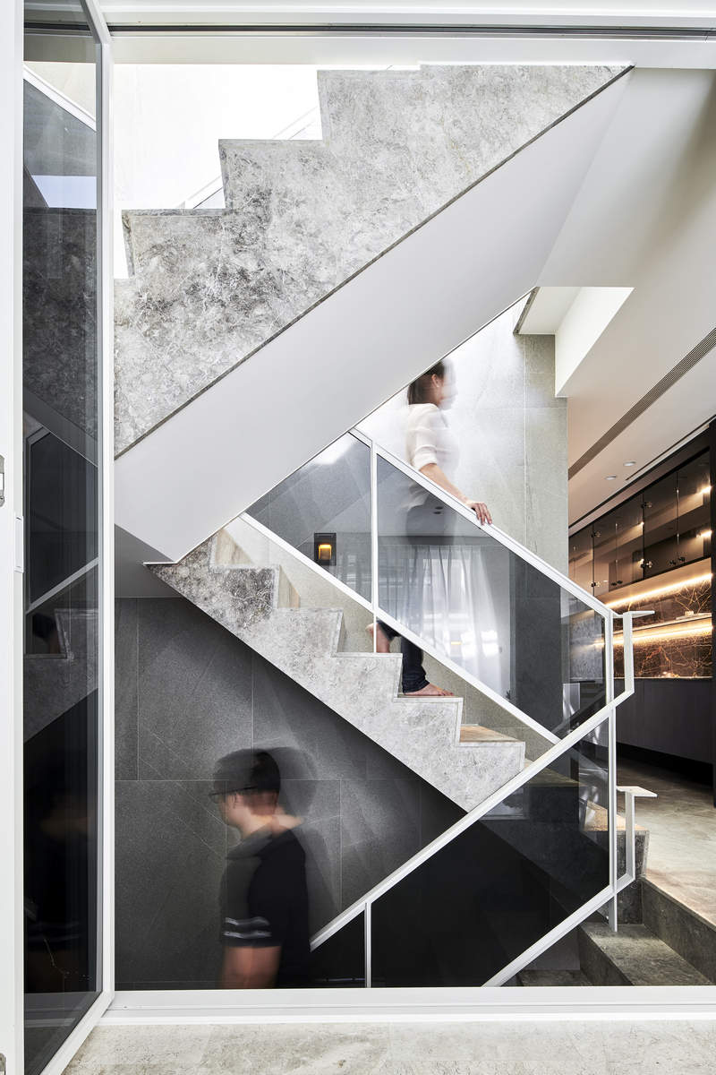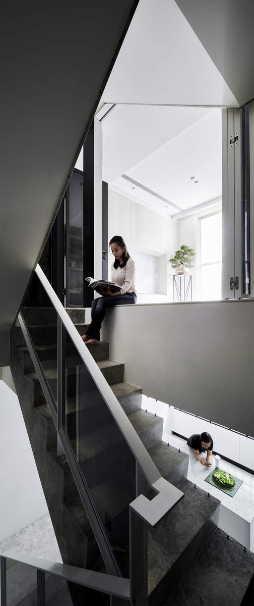 而本建築體其每層的坪數不大,不可能打造巨大的天井,可是境觀設計團隊卻在有限的空間裡,還是細心觀察其空間大小、房子方位、整體長寬、樓面高低,從多方面因素去做考量,竟是在頂樓小花園與健身淋浴間,形塑獨特甚至極具美感的天井,也形成家中最聚焦的美景;可以把古人建築智慧融入現代的生活中,天井如「埕」的概念運用在此建築體內,不僅延續家原本的功能性(休憩、養生、聯誼等),也更注重節能的觀念,讓樓梯間的採光呈現日光藂聚,溫暖的光線無微不至照遍家人,天井以最巧妙方式將光線與空氣引入屋內,連在原本陰沉的樓梯,屋主得以循著灑落的天然光照,邊感受天井上的藍天帶來的開闊感,爬樓梯時的呼吸也更為之舒暢。樓梯動線也變得更優雅,有光彩透亮的效果,尤其能讓樓梯扶手間的黑色隔面,宛如三角鋼琴面聳立在家中!