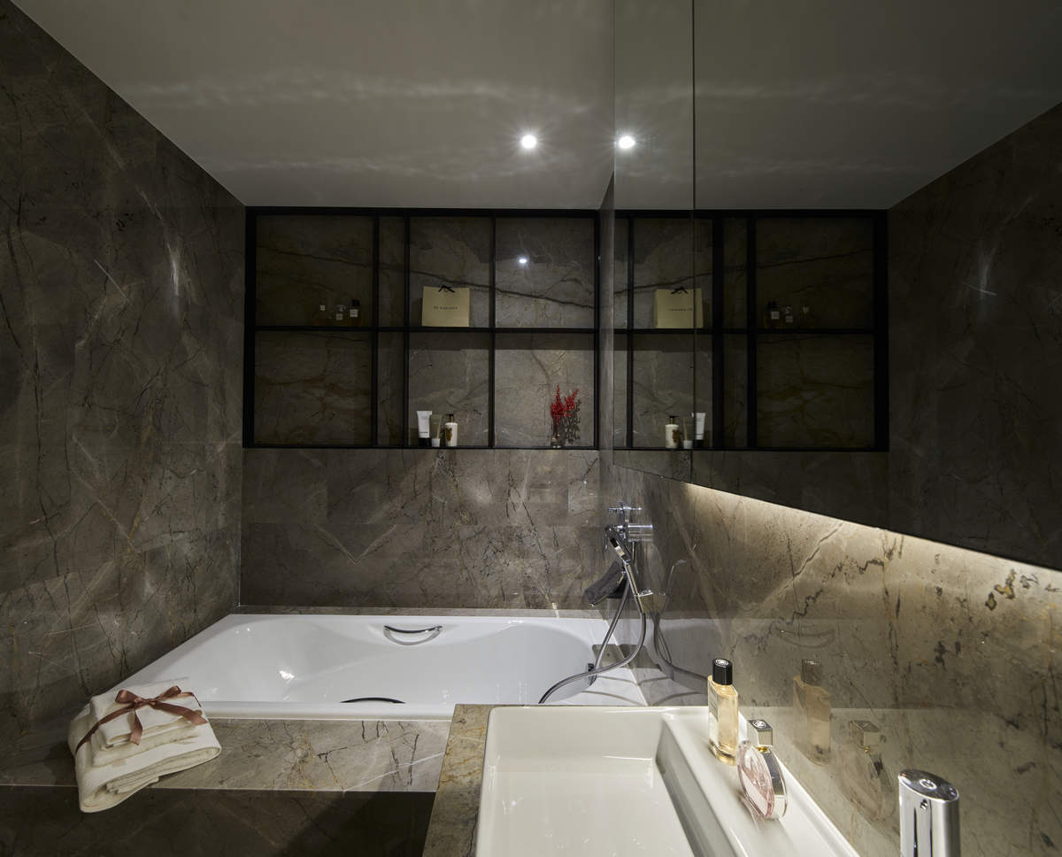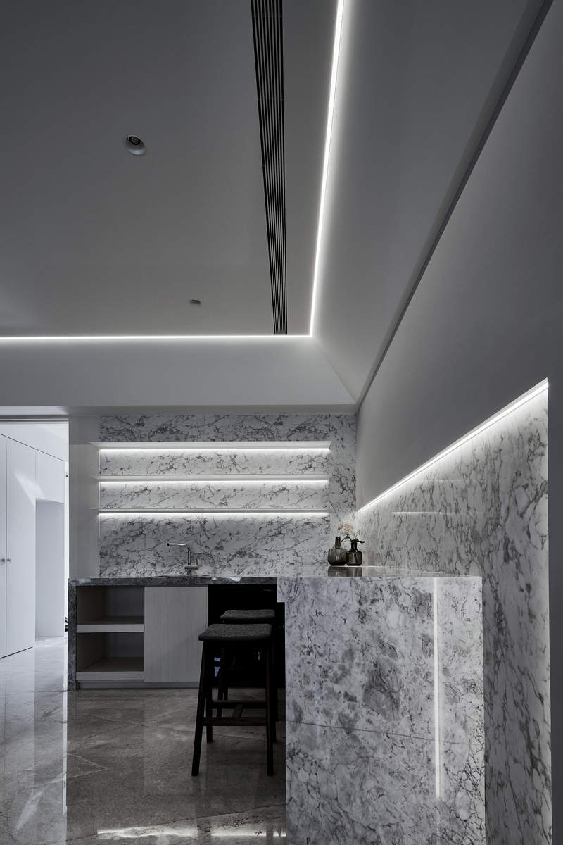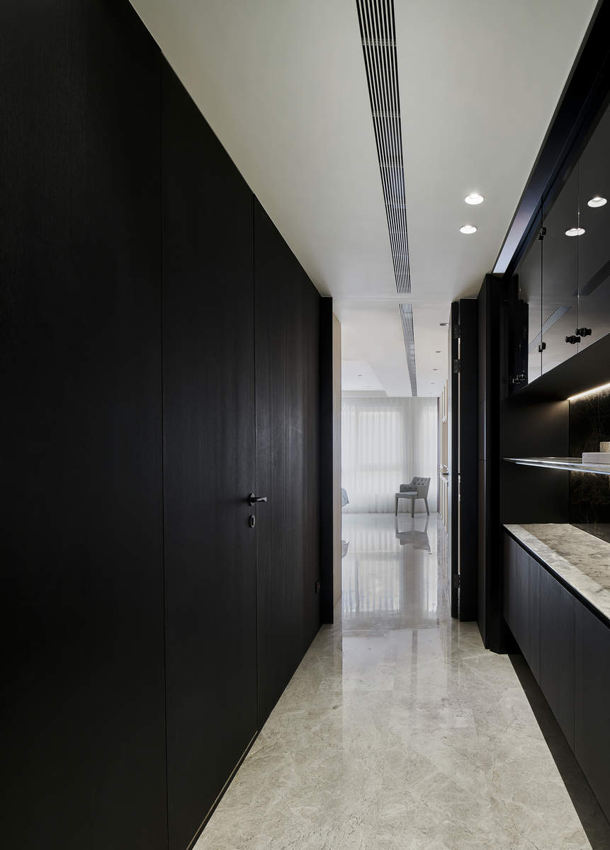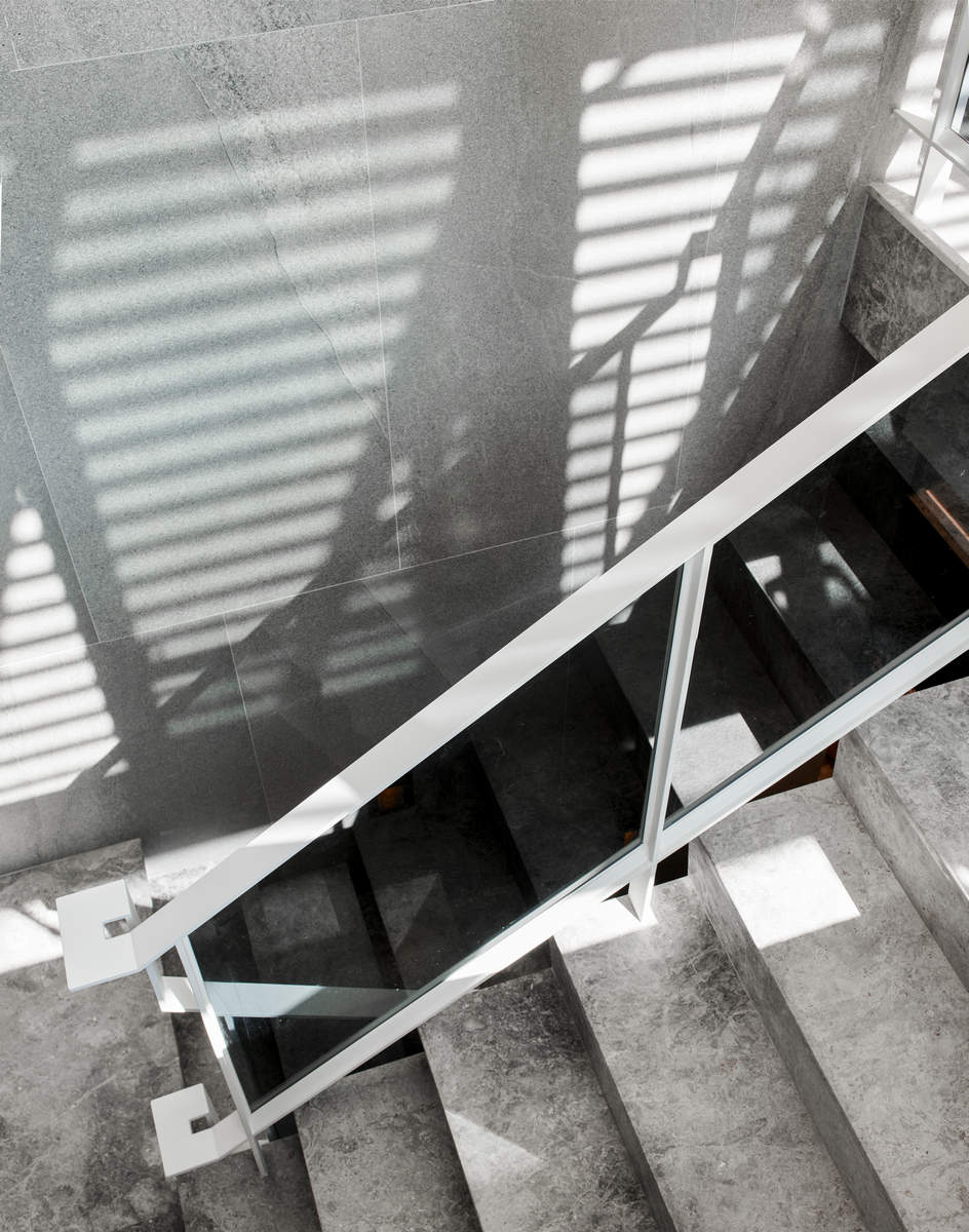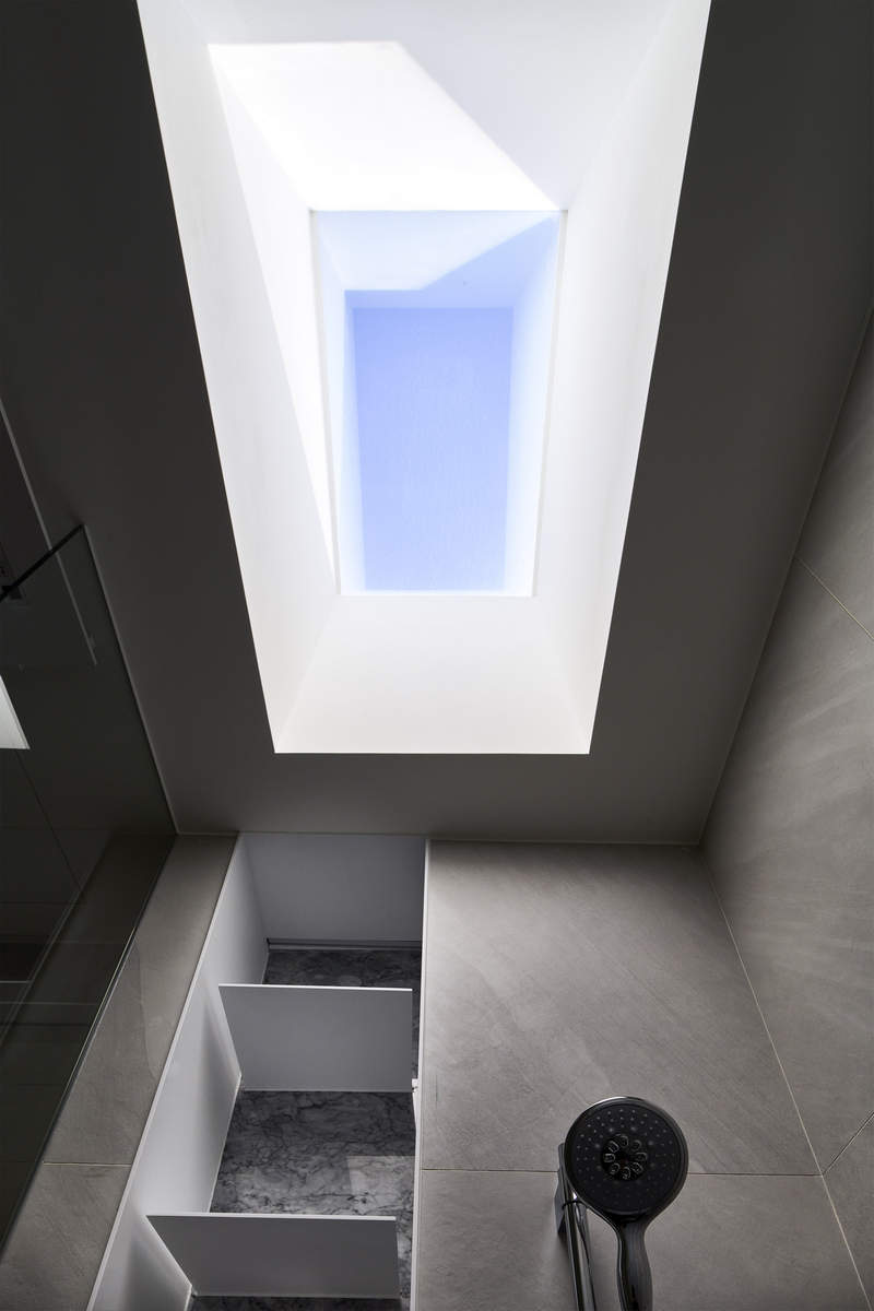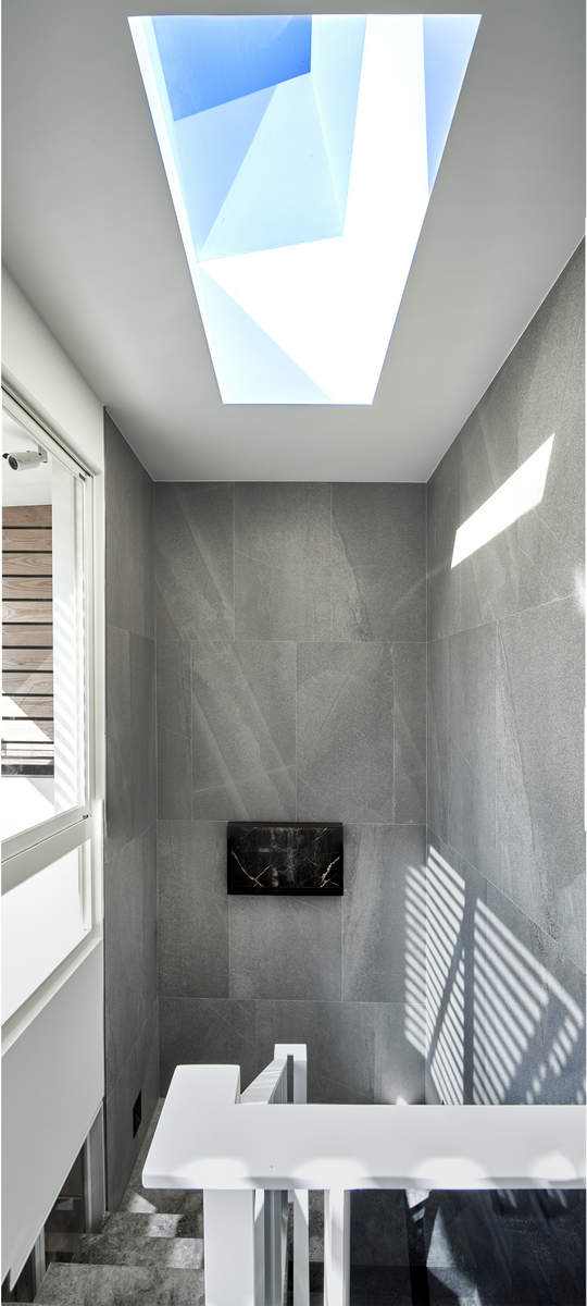 而本建築體其每層的坪數不大,不可能打造巨大的天井,可是境觀設計團隊卻在有限的空間裡,還是細心觀察其空間大小、房子方位、整體長寬、樓面高低,從多方面因素去做考量,竟是在頂樓小花園與健身淋浴間,形塑獨特甚至極具美感的天井,也形成家中最聚焦的美景;可以把古人建築智慧融入現代的生活中,天井如「埕」的概念運用在此建築體內,不僅延續家原本的功能性(休憩、養生、聯誼等),也更注重節能的觀念,讓樓梯間的採光呈現日光藂聚,溫暖的光線無微不至照遍家人,天井以最巧妙方式將光線與空氣引入屋內,連在原本陰沉的樓梯,屋主得以循著灑落的天然光照,邊感受天井上的藍天帶來的開闊感,爬樓梯時的呼吸也更為之舒暢。樓梯動線也變得更優雅,有光彩透亮的效果,尤其能讓樓梯扶手間的黑色隔面,宛如三角鋼琴面聳立在家中!