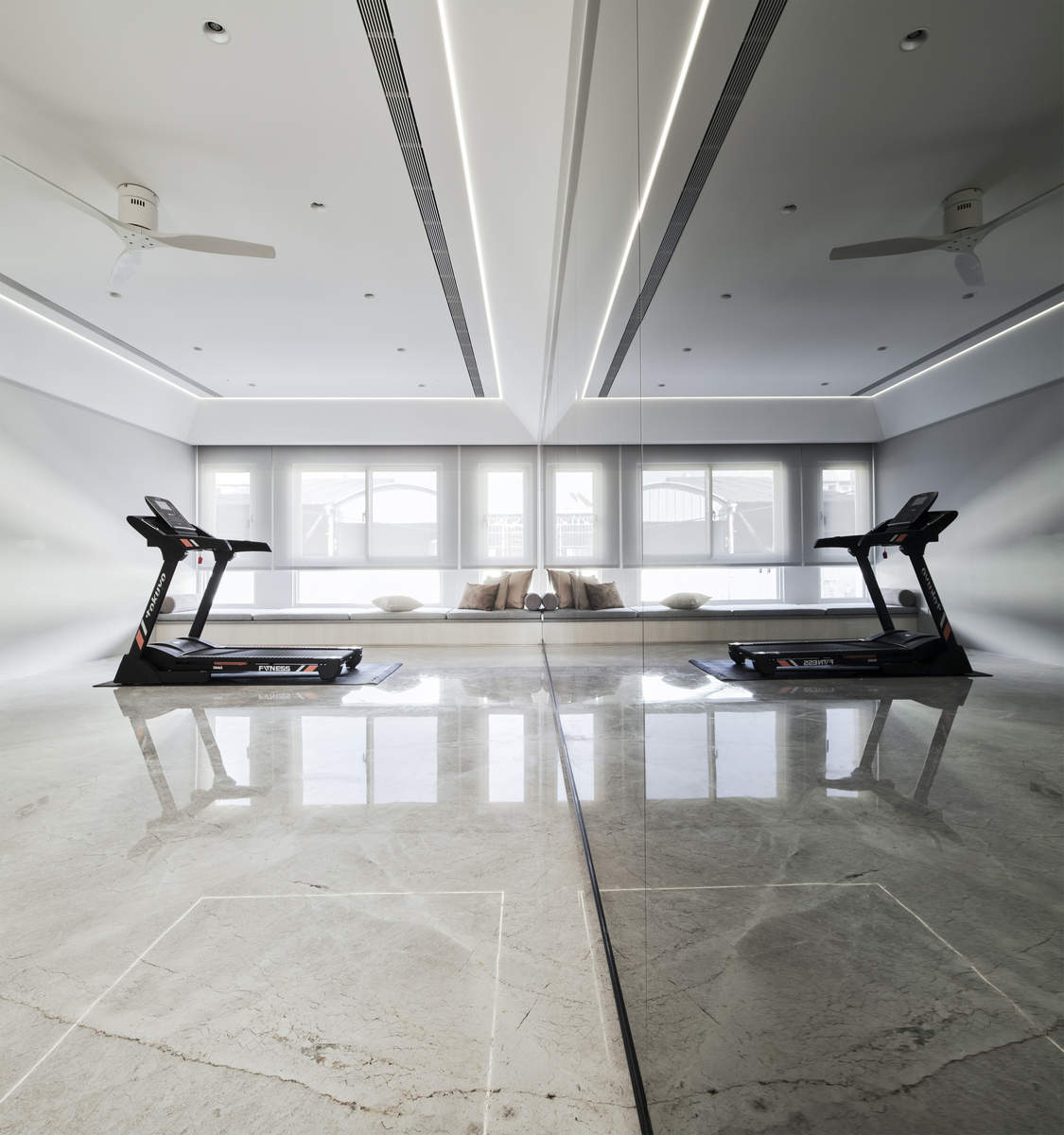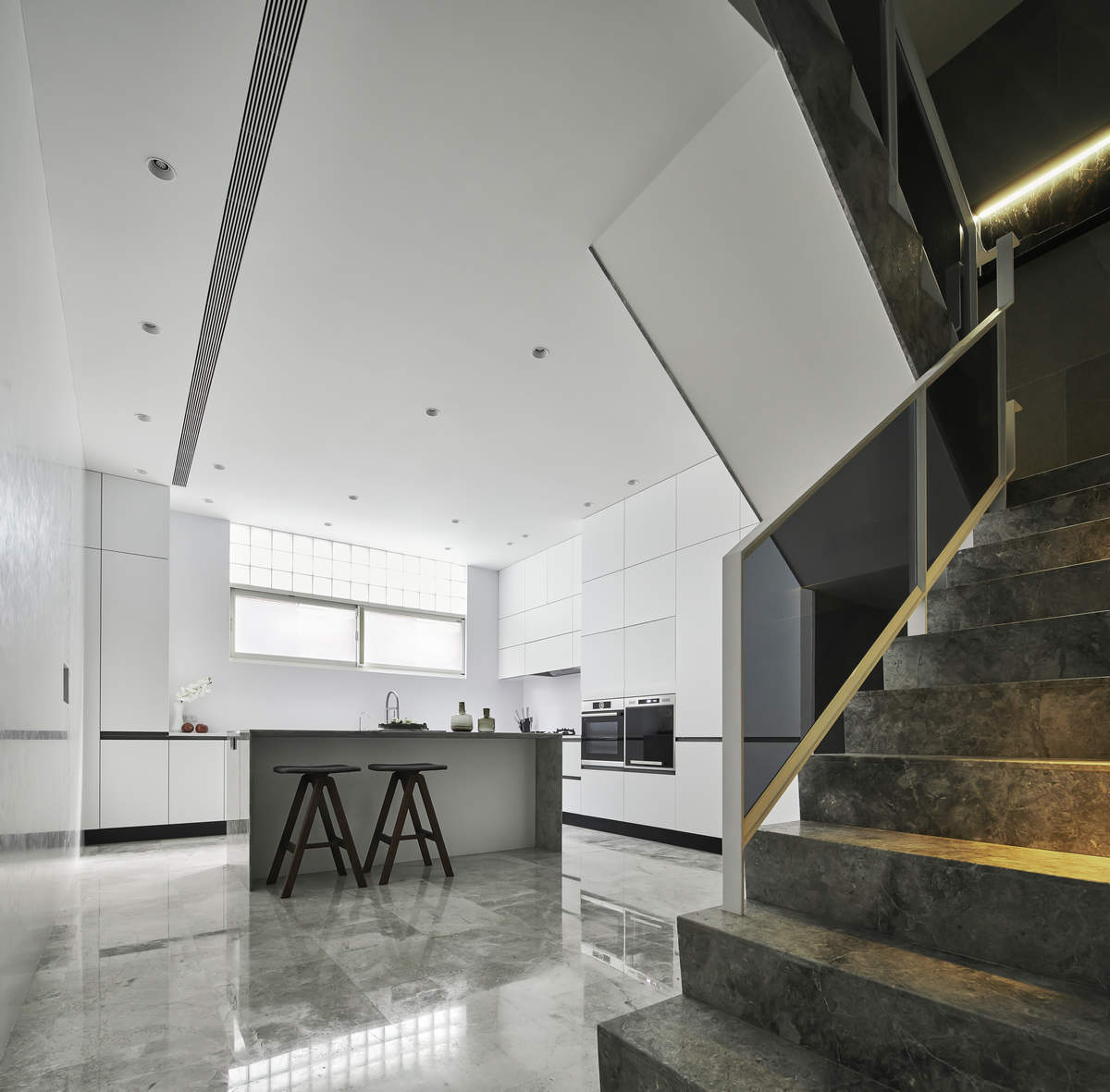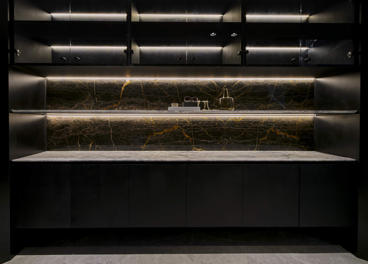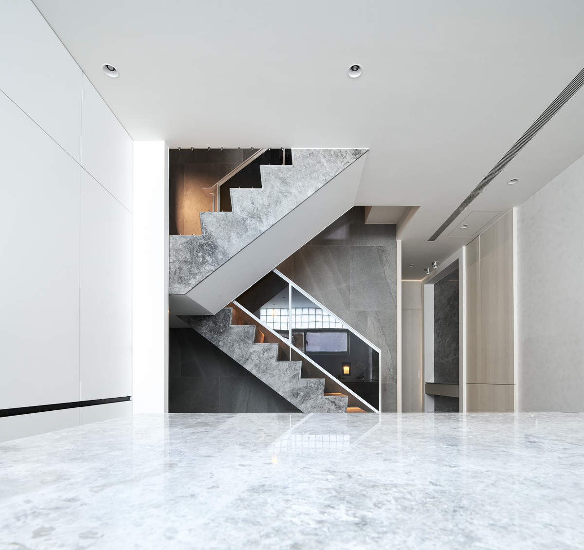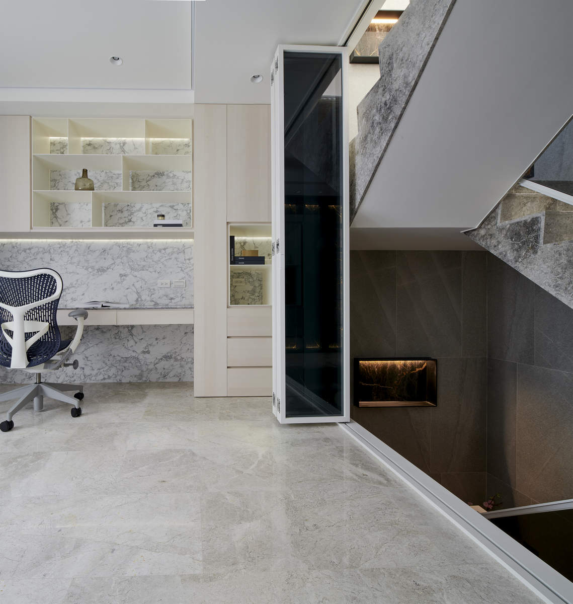 而本建築體其每層的坪數不大,不可能打造巨大的天井,可是境觀設計團隊卻在有限的空間裡,還是細心觀察其空間大小、房子方位、整體長寬、樓面高低,從多方面因素去做考量,竟是在頂樓小花園與健身淋浴間,形塑獨特甚至極具美感的天井,也形成家中最聚焦的美景;可以把古人建築智慧融入現代的生活中,天井如「埕」的概念運用在此建築體內,不僅延續家原本的功能性(休憩、養生、聯誼等),也更注重節能的觀念,讓樓梯間的採光呈現日光藂聚,溫暖的光線無微不至照遍家人,天井以最巧妙方式將光線與空氣引入屋內,連在原本陰沉的樓梯,屋主得以循著灑落的天然光照,邊感受天井上的藍天帶來的開闊感,爬樓梯時的呼吸也更為之舒暢。樓梯動線也變得更優雅,有光彩透亮的效果,尤其能讓樓梯扶手間的黑色隔面,宛如三角鋼琴面聳立在家中!