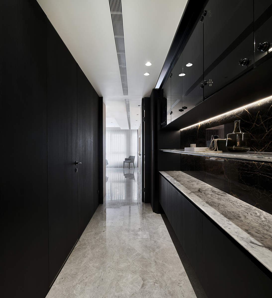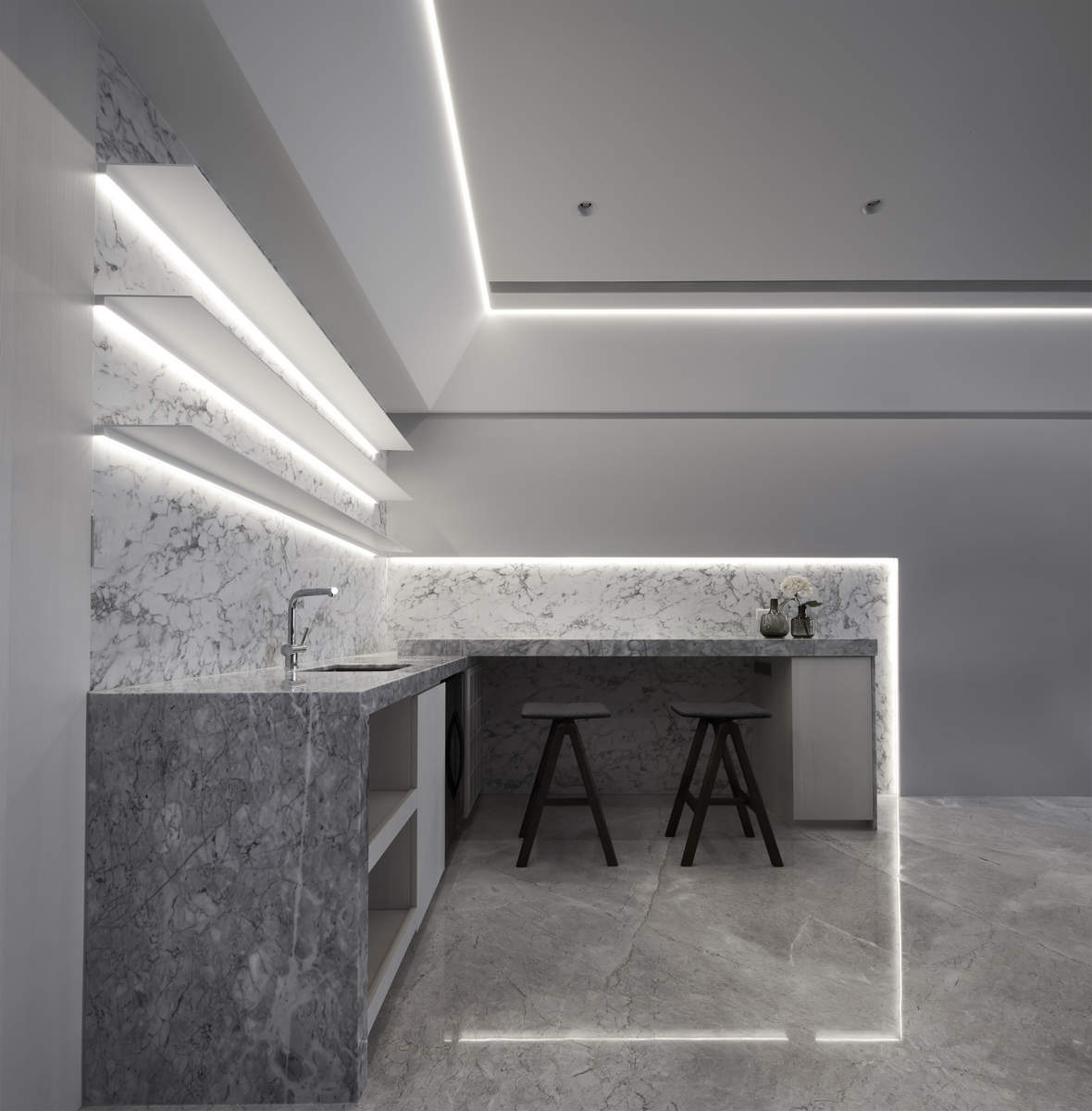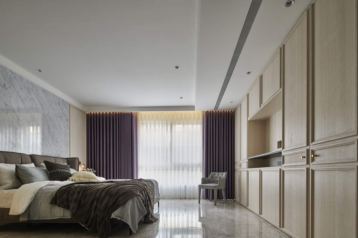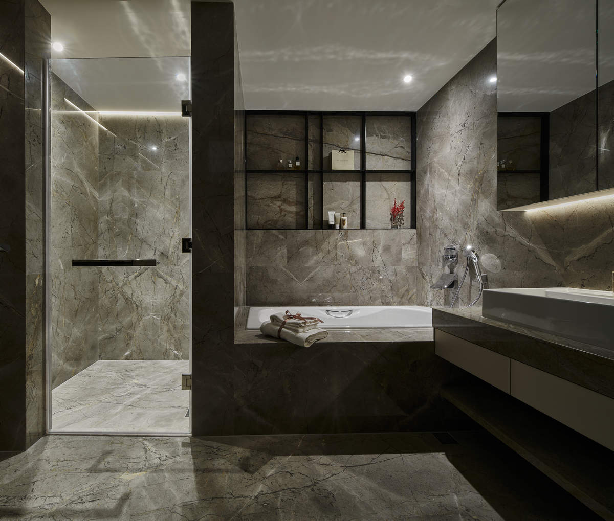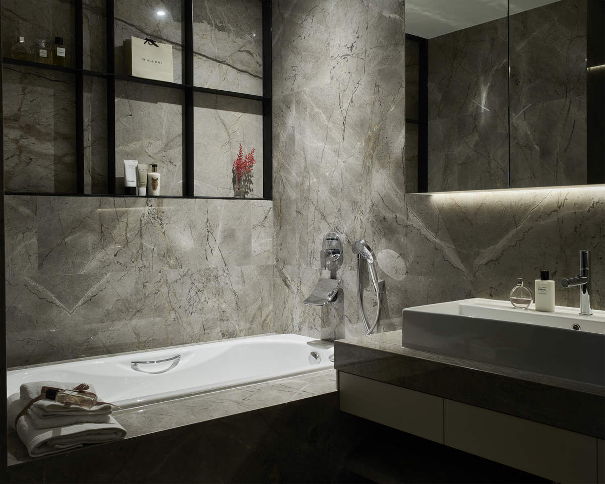 而本建築體其每層的坪數不大,不可能打造巨大的天井,可是境觀設計團隊卻在有限的空間裡,還是細心觀察其空間大小、房子方位、整體長寬、樓面高低,從多方面因素去做考量,竟是在頂樓小花園與健身淋浴間,形塑獨特甚至極具美感的天井,也形成家中最聚焦的美景;可以把古人建築智慧融入現代的生活中,天井如「埕」的概念運用在此建築體內,不僅延續家原本的功能性(休憩、養生、聯誼等),也更注重節能的觀念,讓樓梯間的採光呈現日光藂聚,溫暖的光線無微不至照遍家人,天井以最巧妙方式將光線與空氣引入屋內,連在原本陰沉的樓梯,屋主得以循著灑落的天然光照,邊感受天井上的藍天帶來的開闊感,爬樓梯時的呼吸也更為之舒暢。樓梯動線也變得更優雅,有光彩透亮的效果,尤其能讓樓梯扶手間的黑色隔面,宛如三角鋼琴面聳立在家中!