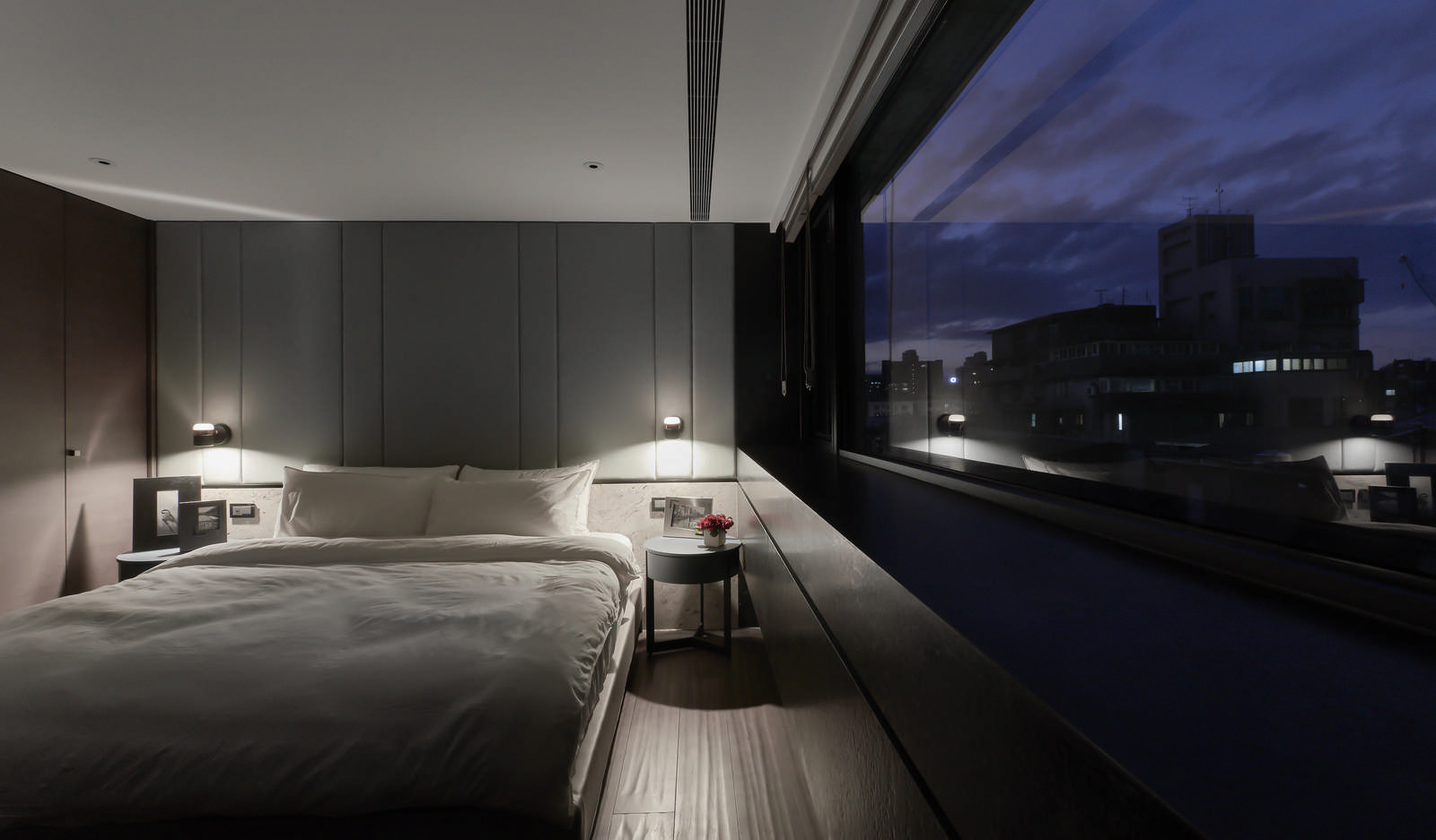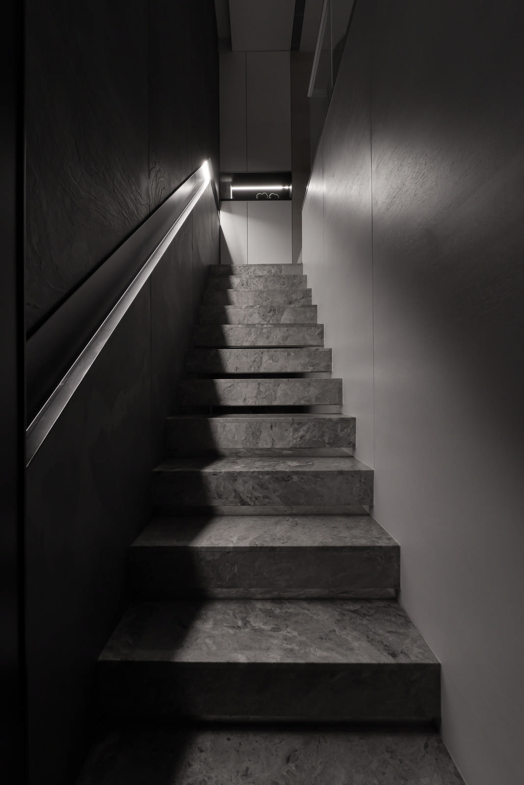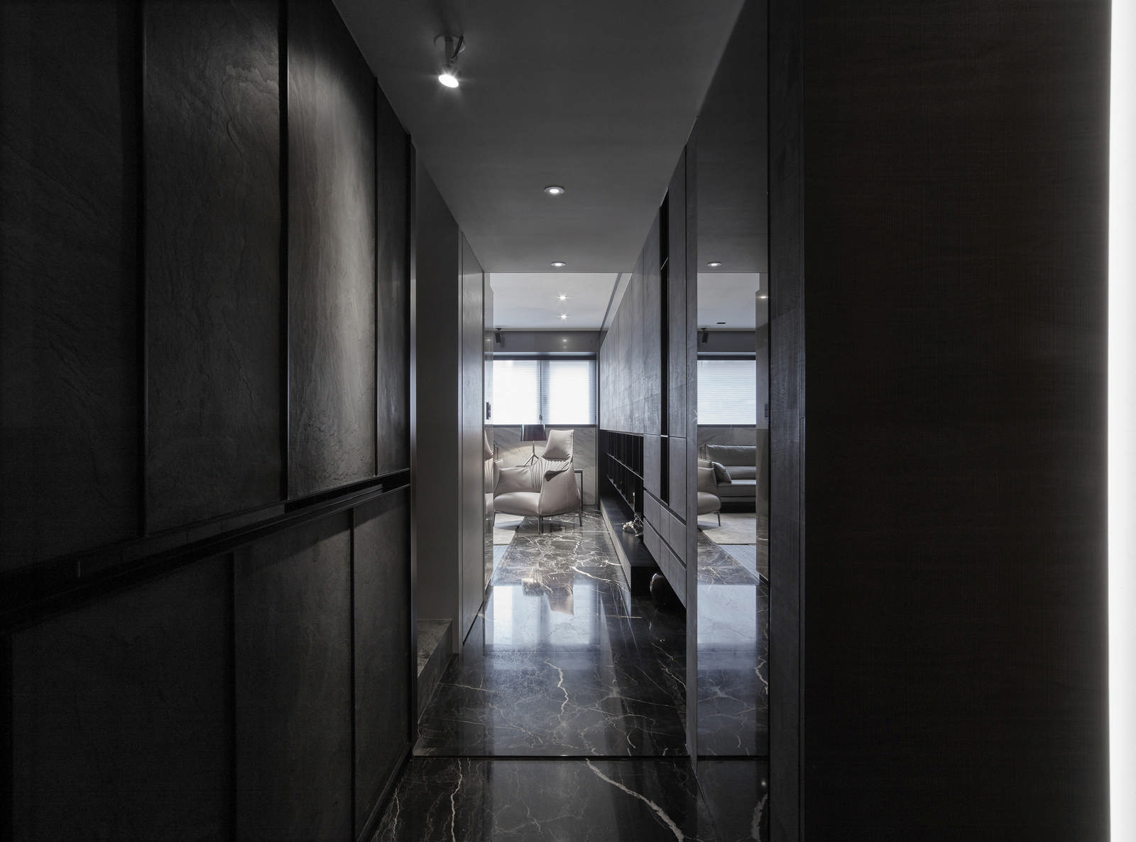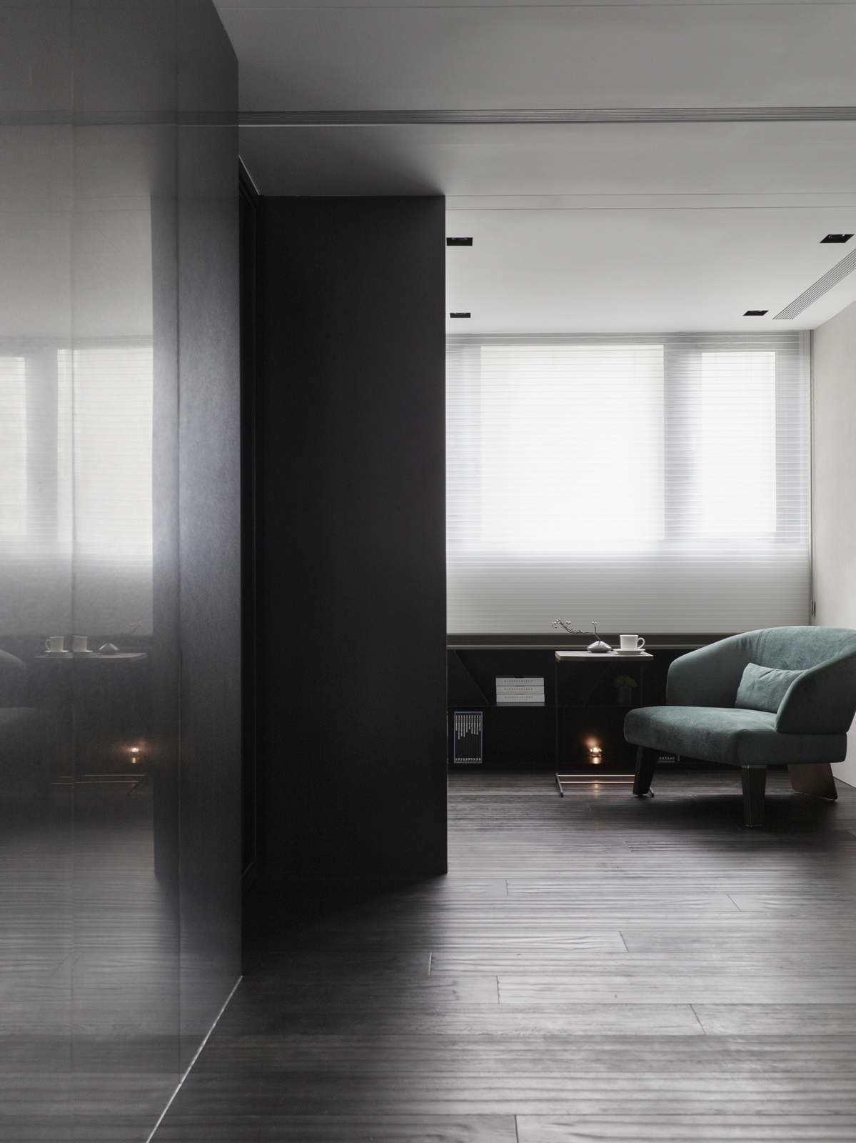 設計語彙以現代風格來呈現,白色為室內基調色,通透的場域輔以穩重色調的木質板材裝設家具層櫃等,溫潤而純淨的氛圍予人放鬆感,在視覺上也形成協調謙容的畫面。階間及走道壁面鋪設頁岩鑲嵌鍍鈦金屬飾條,凹凸樸質的原礦肌理如硯般充滿著墨香韻味。延伸入內,壁面化為氣韻靈動的山巔水態,揮別紛擾開始,走入大師筆下描繪的漫漫山水,從自然中獲得沉靜的力量。